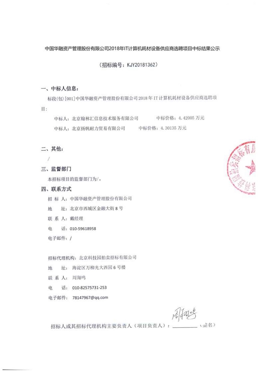 中國華融資產(chǎn)管理股份有限公司2018年IT計算機(jī)耗材設(shè)備供應(yīng)商選聘項目中標(biāo)結(jié)果公示