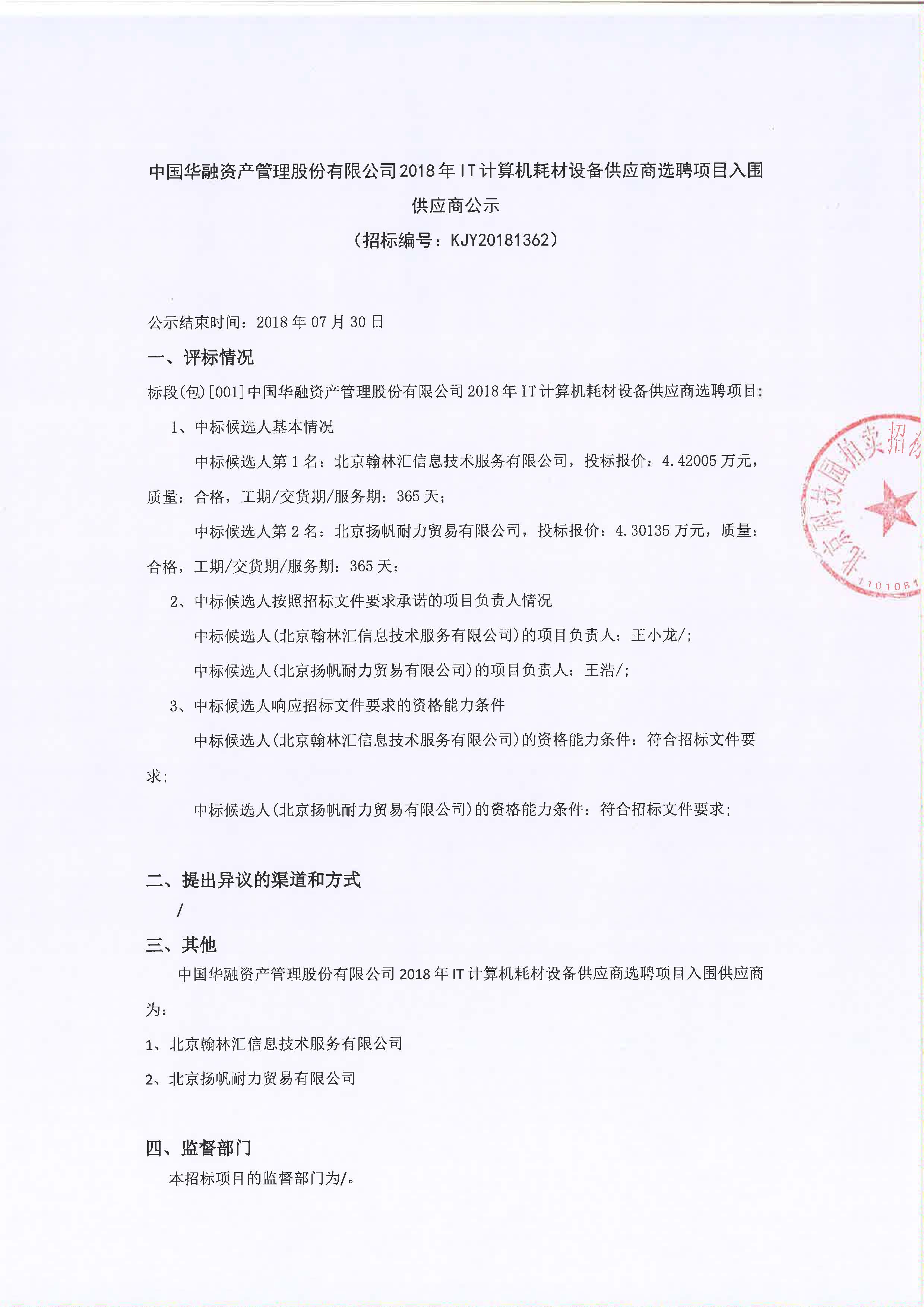 中國(guó)華融資產(chǎn)管理股份有限公司2018年IT計(jì)算機(jī)耗材設(shè)備供應(yīng)商選聘項(xiàng)目入圍供應(yīng)商公示